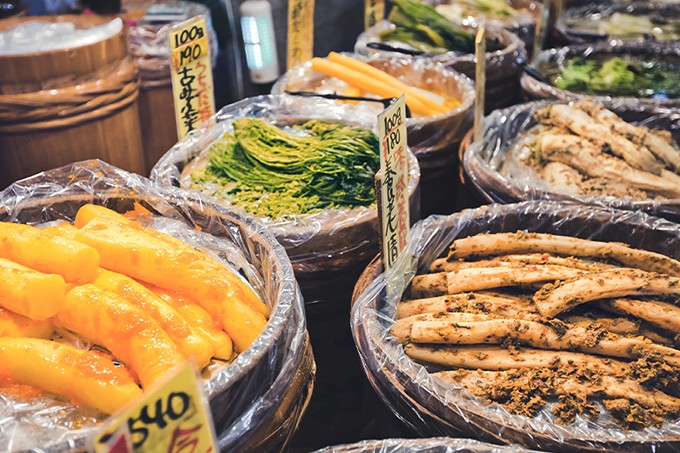 錦市場已有長達四百年的歷史,有京都廚房之美譽的商店街,聚集了各種生鮮食材與傳統京料理的商店,是京都市民最愛逛的市集之一,約有130間舖,大部份都是創業多年的老店。當季的京野菜及漬物在這裡以自然的型態完全展現最道地的京都滋味!