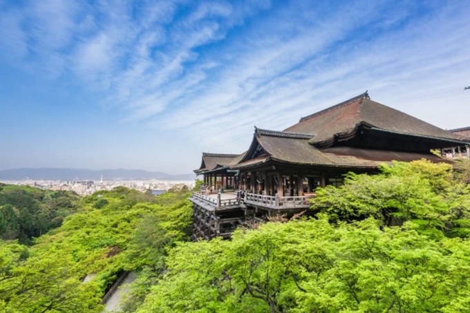 清水寺起源於八世紀末期。現在的建築物是1633年的再建,正殿是國寶,主佛是一面觀音菩薩的木像。清水寺在歷史上,宗教上都占有重要地位,而且廟門前城鎮附近的自然環境保持得很好,從寺內展望京都市街特別漂亮。
